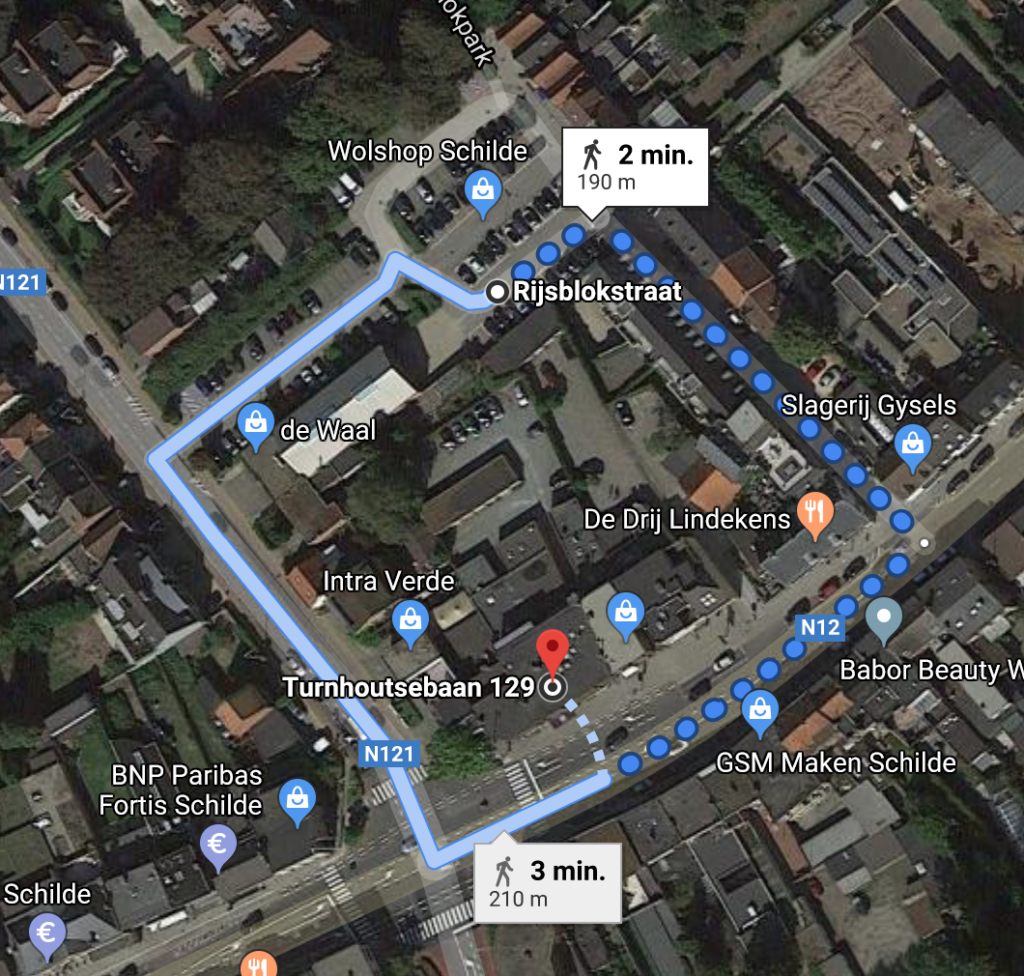 Tevens vindt u op de Rijsblokstraat de gemeentelijke parking van Schilde. Dit is slechts 2 minuten wandelen van het kantoor.